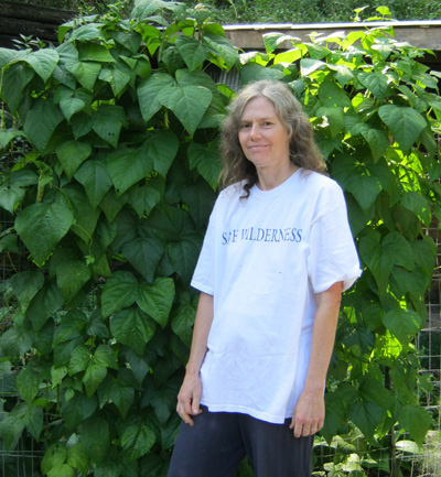 This photo is Nancy in front of her October bean plants in 2015.