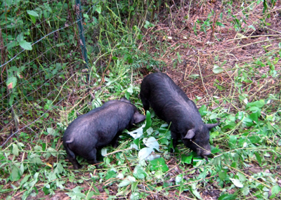 Hog piglets are foraging in our pasture. They will eat just about anything