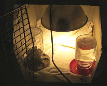 do with 1-day-old chicks you get from a hatchery. You hang the heat lamp